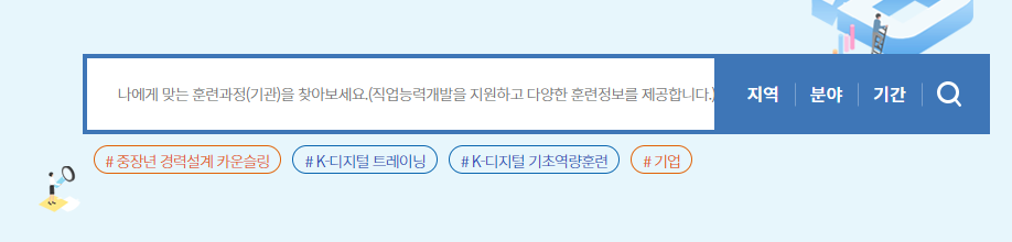 직업훈련포털 hrd-net이라는 홈페이지입니다. 메인 화면에서 지역을 설정해주고 배우고 싶은 자격증을 입력해주시면 국민내일배움카드로 국비 지원이 가능한 학원을 검색해 볼 수 있습니다. 또는 검색 후 지역설정 해주셔도 됩니다.
